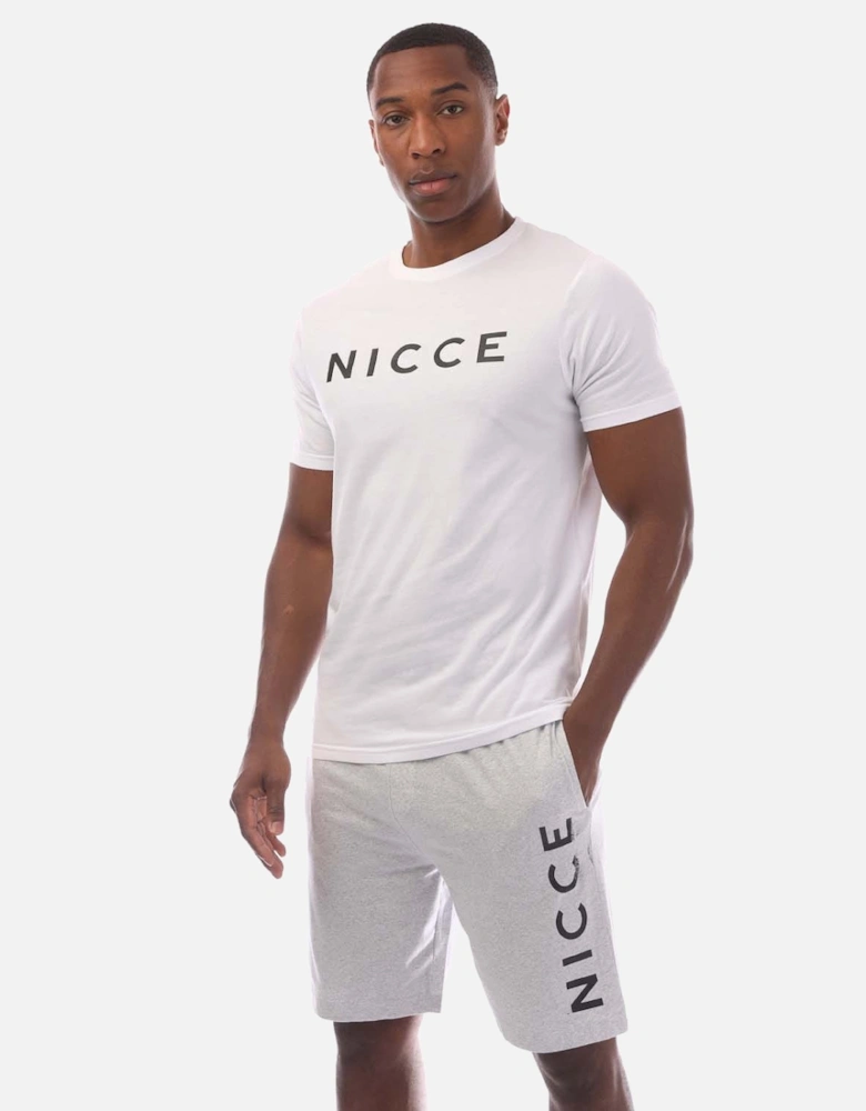 Mens Nicce Aberdeen Lounge Set featuring a Crewneck T-shirt with short sleeves and a printed logo, paired with shorts that have a branded flat elasticated waistband and two slip pockets.