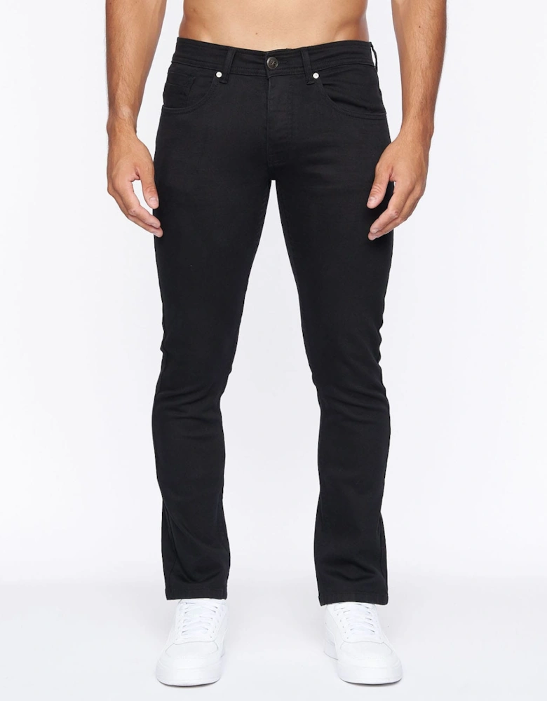 Men's slim fit jeans featuring a 5-pocket design, branded buttons, and a button fly for easy wear.