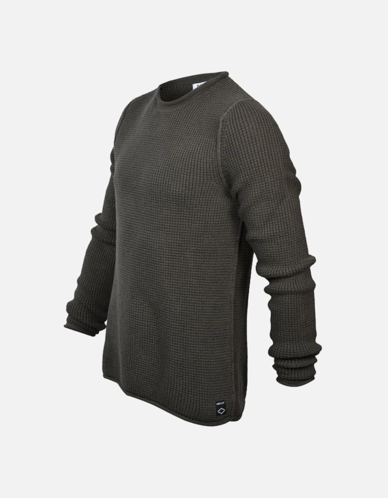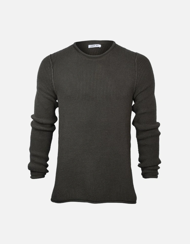 A stylish heavy-knit crew-neck jumper made from Italian yarn, featuring a comfortable blend of cotton, polyester, and elastane, available in a rich dark olive hue.