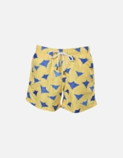 Stylish swimming shorts in sun yellow with navy accents, made from 100% recycled polyester for an eco-friendly swimwear option.
