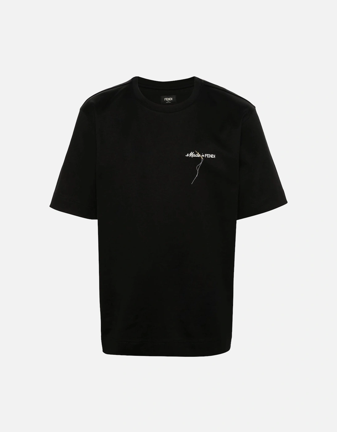 A luxurious black cotton t-shirt featuring 'Made in Fendi' embroidery, combining refined craftsmanship with a modern design.