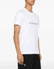 Designed with a flattering true-to-size fit, the tee features a structured ribbed crew neckline and short sleeves for a clean, tailored silhouette. The standout element lies in the bold contrast Givenchy Paris logo, subtly reversed across the front and mirrored at the back—delivering a distinctive twist on a timeless classic.