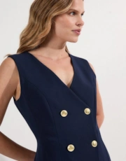 Product code: BKK25782 Style Notes This Karen Millen tailored midi dress combines timeless sophistication with modern practicality. The structured bodice with its wrap neckline creates a refined silhouette, whilst the double-breasted gold buttons add a touch of authority to your workwear collection. The full skirted design with careful pleating creates movement and dimension, making this piece both flattering and functional for busy days at the office. Style with strappy heels and a structured tote for important meetings, or dress down with block-heeled court shoes and a tailored blazer for everyday elegance. The stretch fabric ensures comfort throughout your working day without compromising on polish. This versatile piece transitions seamlessly from boardroom presentations to after-work functions, making it an essential addition to your professional wardrobe. Sleeveless tailored midi dress with wrap neckline Double-breasted gold button detailing Full skirted design with pleating Stretch fabric construction Versatile midi lengths Details & Care Main: 64% Polyester. 31% Viscose/Rayon. 5% Elastane/Spandex. Lining: 100% Polyester. Dry clean only. Model wears UK 8/US 4. Model Height 5"9.