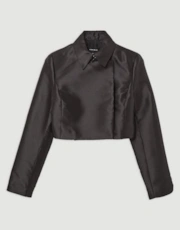 Elevate your summer wardrobe with The Founder Satin Twill Cropped Wrap Tailored Jacket, featuring a luxurious satin feel, classic collar, and stylish wrap design, perfect for formal occasions or sophisticated office wear.