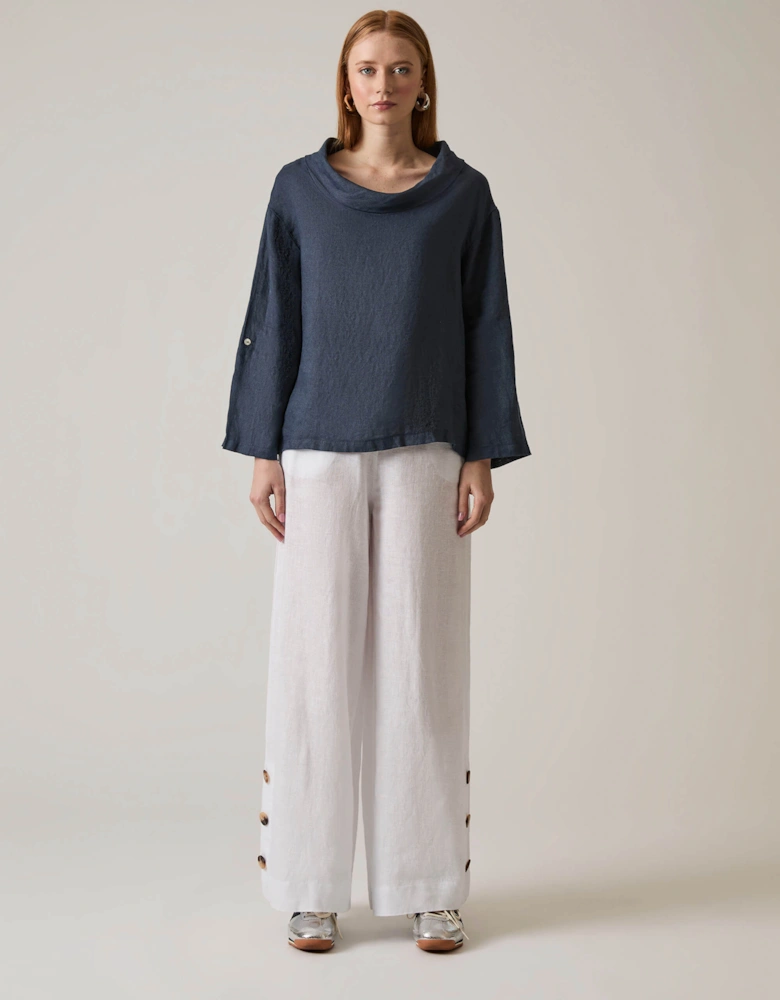 Effortlessly elegant Cowl Neck Linen Navy Top with a relaxed silhouette and versatile styling options.