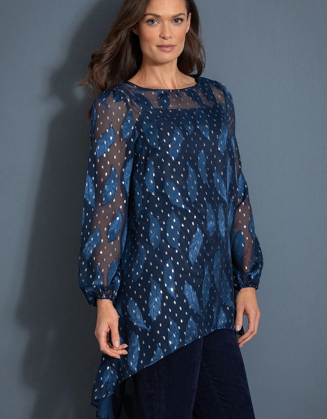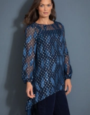 Feather shimmer dip hem georgette tunic top