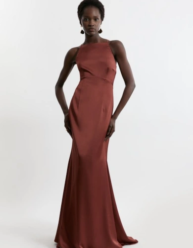 Drama Halter Pleat Insert Woven Satin Maxi Dress