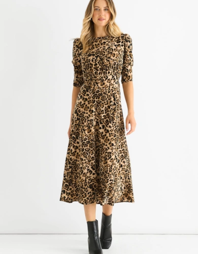 Structured Viscose Satin Animal Print Tailored Prom Maxi Dress