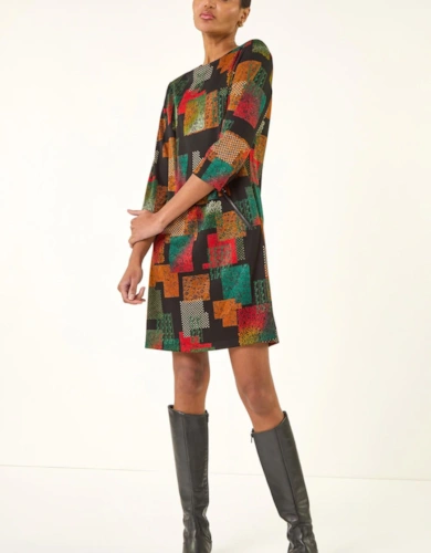 Black Spot Print Shirred Waist Shift Midi Dress