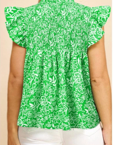 Green Floral Flutter Sleeve Shirred Notched Neck Plus Size Blouse