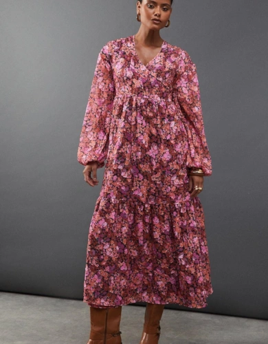 Petite Animal Organza Puff Sleeve Midi Smock Dress