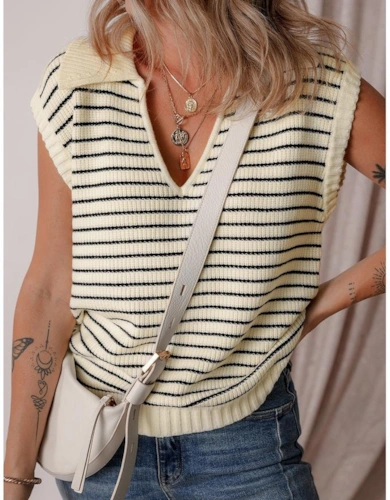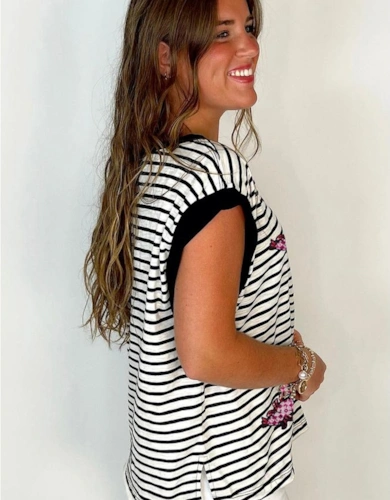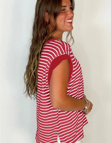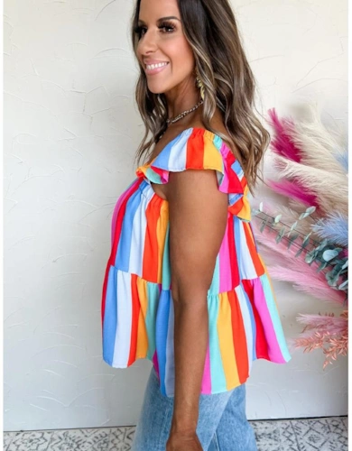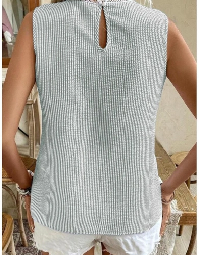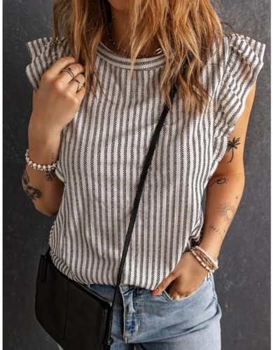 Gray Crew Neck Ruffled Striped Tank Top