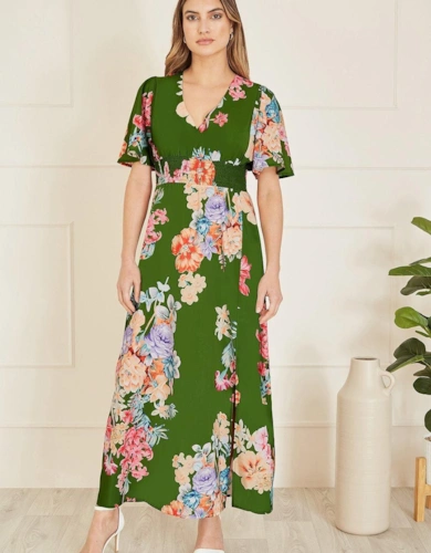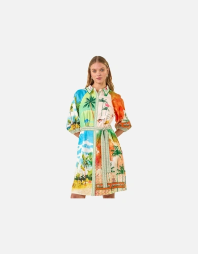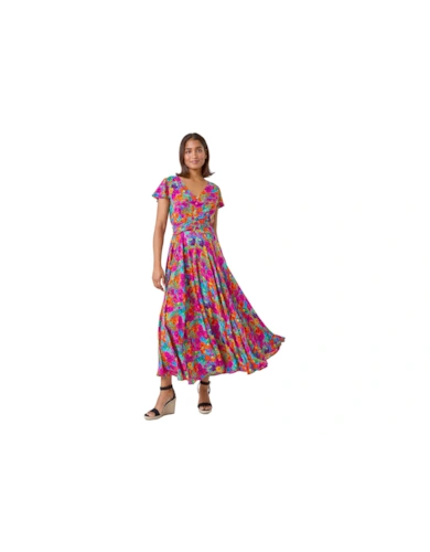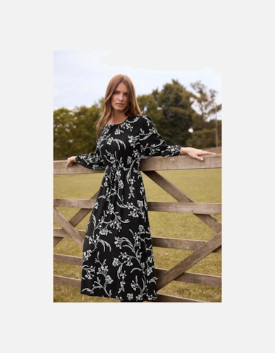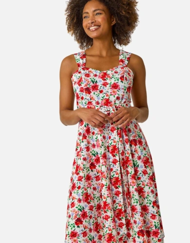 Premium Linen Tab Waist Detail Full Skirt Tailored Midi Dress