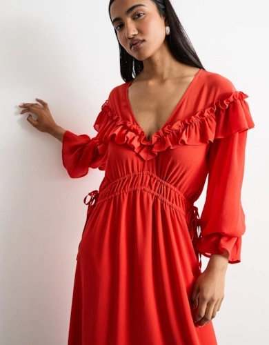 Petite Dobby Chiffon Plunge Neck Ruffle Midi Smock Dress