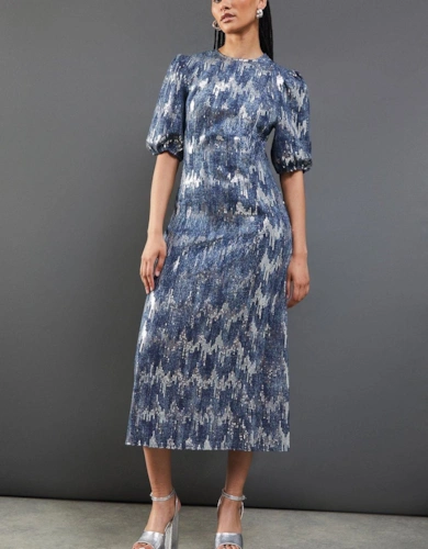 Sequin Crinkle Batwing Plunge Neck Midi Dress