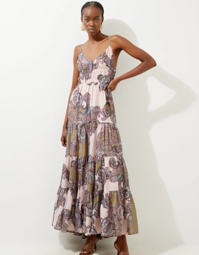 Viscose Sparkle Tie Detail Tiered Skirt Woven Maxi Dress