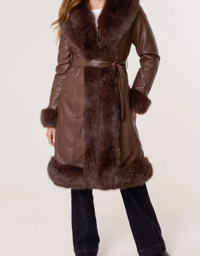 Wool Blend Detachable Faux Fur Belted Midi Coat