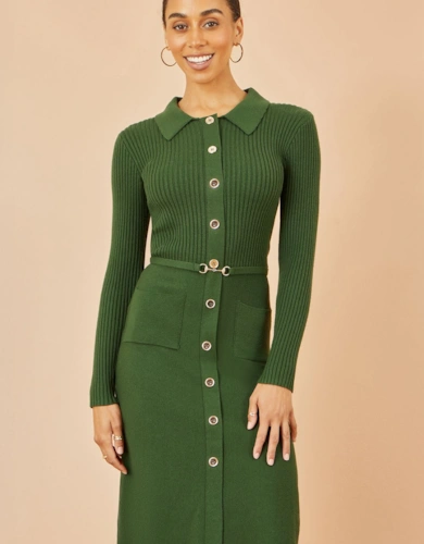 Green Long Sleeve Midi Dress With Floral Embroidery Bodice